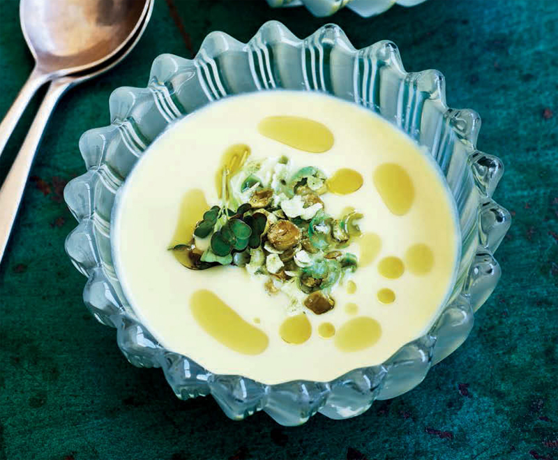 This is a chilled, lightly tart, savoury and refreshing soup. Completely dairy free, the white miso adds umami flavour and creaminess without the lactose. I love using Primary Konbu Dashi or a good-quality vegetable stock for a vegetarian soup but you can also use Primary Dashi, which contains fish. The tarragon oil and hot wasabi peas are optional but both add layers of flavour and texture that go really well in this soup.