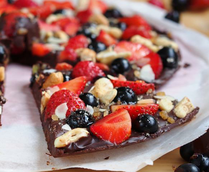 Decorate, soft chocolate "pizza", pressing his hands into the chocolate lightly, strawberries, black currants and nuts, sprinkled with sugar. Berries are sour and chocolate, so it's best to add sweets! Put back in the fridge to harden chocolate for about 1 hour. |