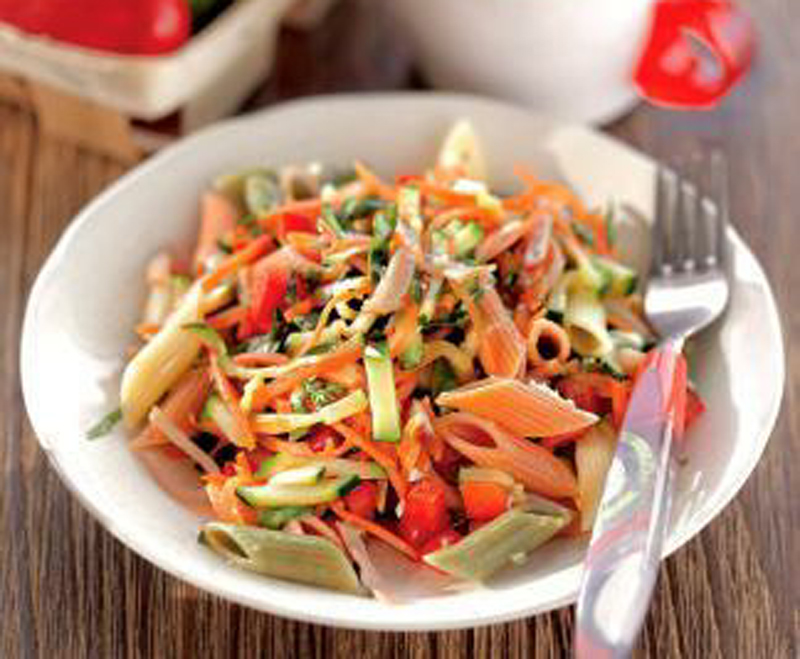 Mix 3 tbsp oil, lemon juice, chopped garlic and Basil stems. Stir fried vegetables, sweet pepper, ham, Basil leaves and pasta, dress the salad with sauce.